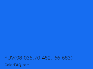 YUV 98.035,70.482,-66.683 Color is a normal blue color and the nearest color is Blue Crayola #1f75fe. Hex code #166df1 and RGB value is rgb(22,109,241). In RGB color space, this color is composed of 9% red, 43% green, 95% blue, In CMYK color space, this color is composed of 91% cyan, 55% magenta, 0% yellow , 5% black , In HSL color space, this color has a hue angle of 216° , 89% saturation and 52% lightness.