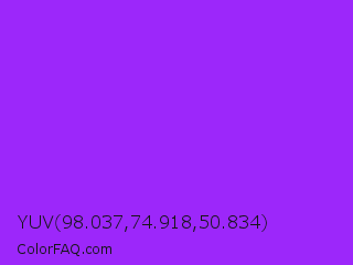 YUV 98.037,74.918,50.834 Color is a normal purple color and the nearest color is Veronica #a020f0. Hex code #9c27fa and RGB value is rgb(156,39,250). In RGB color space, this color is composed of 61% red, 15% green, 98% blue, In CMYK color space, this color is composed of 38% cyan, 84% magenta, 0% yellow , 2% black , In HSL color space, this color has a hue angle of 273° , 95% saturation and 57% lightness.