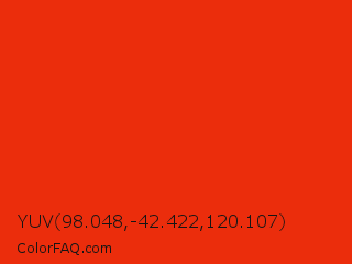 YUV 98.048,-42.422,120.107 Color is a normal red color and the nearest color is Red RYB #fe2712. Hex code #eb2d0c and RGB value is rgb(235,45,12). In RGB color space, this color is composed of 92% red, 18% green, 5% blue, In CMYK color space, this color is composed of 0% cyan, 81% magenta, 95% yellow , 8% black , In HSL color space, this color has a hue angle of 9° , 90% saturation and 48% lightness.