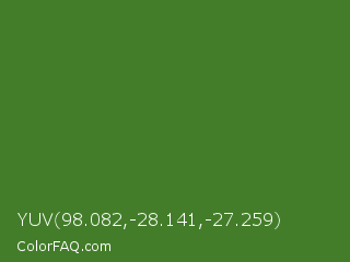 YUV 98.082,-28.141,-27.259 Color is a normal green color and the nearest color is Sap Green #507d2a. Hex code #437d29 and RGB value is rgb(67,125,41). In RGB color space, this color is composed of 26% red, 49% green, 16% blue, In CMYK color space, this color is composed of 46% cyan, 0% magenta, 67% yellow , 51% black , In HSL color space, this color has a hue angle of 101° , 51% saturation and 33% lightness.