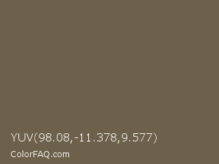 YUV 98.08,-11.378,9.577 Color is a normal orange color and the nearest color is Soya Bean #6a6051. Hex code #6d614b and RGB value is rgb(109,97,75). In RGB color space, this color is composed of 43% red, 38% green, 29% blue, In CMYK color space, this color is composed of 0% cyan, 11% magenta, 31% yellow , 57% black , In HSL color space, this color has a hue angle of 39° , 18% saturation and 36% lightness.