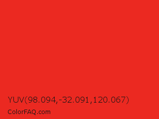 YUV 98.094,-32.091,120.067 Color is a normal red color and the nearest color is Lust #e62020. Hex code #eb2921 and RGB value is rgb(235,41,33). In RGB color space, this color is composed of 92% red, 16% green, 13% blue, In CMYK color space, this color is composed of 0% cyan, 83% magenta, 86% yellow , 8% black , In HSL color space, this color has a hue angle of 2° , 83% saturation and 53% lightness.