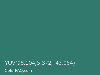 YUV 98.104,5.372,-43.064 Color is a normal cyan color and the nearest color is Myrtle Green #317873. Hex code #31796d and RGB value is rgb(49,121,109). In RGB color space, this color is composed of 19% red, 47% green, 43% blue, In CMYK color space, this color is composed of 60% cyan, 0% magenta, 10% yellow , 53% black , In HSL color space, this color has a hue angle of 170° , 42% saturation and 33% lightness.