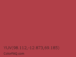 YUV 98.112,-12.873,69.185 Color is a normal red color and the nearest color is Apple Blossom #af4d43. Hex code #b13f48 and RGB value is rgb(177,63,72). In RGB color space, this color is composed of 69% red, 25% green, 28% blue, In CMYK color space, this color is composed of 0% cyan, 64% magenta, 59% yellow , 31% black , In HSL color space, this color has a hue angle of 355° , 48% saturation and 47% lightness.