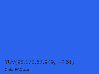 YUV 98.173,67.949,-47.51 Color is a normal blue color and the nearest color is Ultramarine Blue #4166f5. Hex code #2c63ec and RGB value is rgb(44,99,236). In RGB color space, this color is composed of 17% red, 39% green, 93% blue, In CMYK color space, this color is composed of 81% cyan, 58% magenta, 0% yellow , 7% black , In HSL color space, this color has a hue angle of 223° , 83% saturation and 55% lightness.