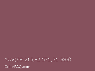YUV 98.215,-2.571,31.383 Color is a normal red color and the nearest color is Deep Taupe #7e5e60. Hex code #86515d and RGB value is rgb(134,81,93). In RGB color space, this color is composed of 53% red, 32% green, 36% blue, In CMYK color space, this color is composed of 0% cyan, 40% magenta, 31% yellow , 47% black , In HSL color space, this color has a hue angle of 346° , 25% saturation and 42% lightness.