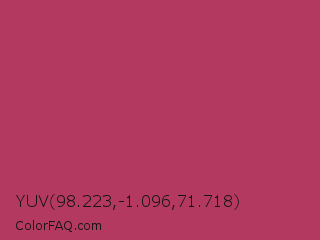 YUV 98.223,-1.096,71.718 Color is a normal rose color and the nearest color is Rich Maroon #b03060. Hex code #b43960 and RGB value is rgb(180,57,96). In RGB color space, this color is composed of 71% red, 22% green, 38% blue, In CMYK color space, this color is composed of 0% cyan, 68% magenta, 47% yellow , 29% black , In HSL color space, this color has a hue angle of 341° , 52% saturation and 46% lightness.