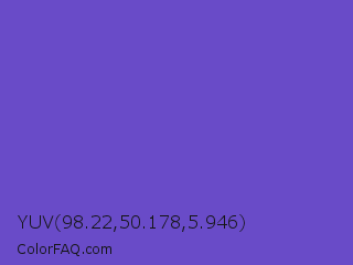 YUV 98.22,50.178,5.946 Color is a normal indigo color and the nearest color is Slate Blue #6a5acd. Hex code #694bc8 and RGB value is rgb(105,75,200). In RGB color space, this color is composed of 41% red, 29% green, 78% blue, In CMYK color space, this color is composed of 48% cyan, 63% magenta, 0% yellow , 22% black , In HSL color space, this color has a hue angle of 254° , 53% saturation and 54% lightness.