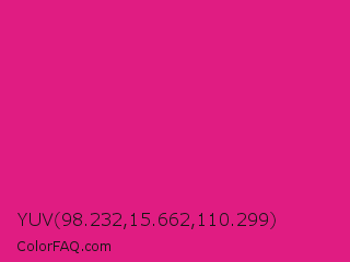 YUV 98.232,15.662,110.299 Color is a normal rose color and the nearest color is Vivid Cerise #da1d81. Hex code #e01c82 and RGB value is rgb(224,28,130). In RGB color space, this color is composed of 88% red, 11% green, 51% blue, In CMYK color space, this color is composed of 0% cyan, 88% magenta, 42% yellow , 12% black , In HSL color space, this color has a hue angle of 329° , 78% saturation and 49% lightness.