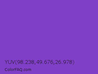 YUV 98.238,49.676,26.978 Color is a normal violet color and the nearest color is Fuchsia Blue #7a58c1. Hex code #813fc7 and RGB value is rgb(129,63,199). In RGB color space, this color is composed of 51% red, 25% green, 78% blue, In CMYK color space, this color is composed of 35% cyan, 68% magenta, 0% yellow , 22% black , In HSL color space, this color has a hue angle of 269° , 55% saturation and 51% lightness.