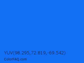 YUV 98.295,72.819,-69.542 Color is a normal blue color and the nearest color is Blue Crayola #1f75fe. Hex code #136ef6 and RGB value is rgb(19,110,246). In RGB color space, this color is composed of 7% red, 43% green, 96% blue, In CMYK color space, this color is composed of 92% cyan, 55% magenta, 0% yellow , 4% black , In HSL color space, this color has a hue angle of 216° , 93% saturation and 52% lightness.
