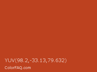 YUV 98.2,-33.13,79.632 Color is a normal red color and the nearest color is Dark Pastel Red #c23b22. Hex code #bd411f and RGB value is rgb(189,65,31). In RGB color space, this color is composed of 74% red, 25% green, 12% blue, In CMYK color space, this color is composed of 0% cyan, 66% magenta, 84% yellow , 26% black , In HSL color space, this color has a hue angle of 13° , 72% saturation and 43% lightness.