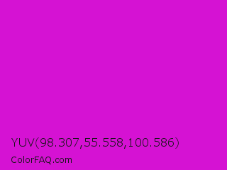 YUV 98.307,55.558,100.586 Color is a normal magenta color and the nearest color is Deep Magenta #cc00cc. Hex code #d512d3 and RGB value is rgb(213,18,211). In RGB color space, this color is composed of 84% red, 7% green, 83% blue, In CMYK color space, this color is composed of 0% cyan, 92% magenta, 1% yellow , 16% black , In HSL color space, this color has a hue angle of 301° , 84% saturation and 45% lightness.