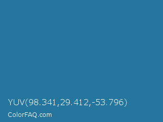 YUV 98.341,29.412,-53.796 Color is a normal blue color and the nearest color is Jelly Bean #297b9a. Hex code #25769e and RGB value is rgb(37,118,158). In RGB color space, this color is composed of 15% red, 46% green, 62% blue, In CMYK color space, this color is composed of 77% cyan, 25% magenta, 0% yellow , 38% black , In HSL color space, this color has a hue angle of 200° , 62% saturation and 38% lightness.