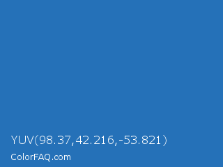 YUV 98.37,42.216,-53.821 Color is a normal blue color and the nearest color is Mariner #286acd. Hex code #2571b8 and RGB value is rgb(37,113,184). In RGB color space, this color is composed of 15% red, 44% green, 72% blue, In CMYK color space, this color is composed of 80% cyan, 39% magenta, 0% yellow , 28% black , In HSL color space, this color has a hue angle of 209° , 67% saturation and 43% lightness.