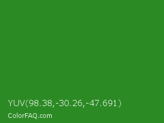 YUV 98.38,-30.26,-47.691 Color is a normal green color and the nearest color is Forest Green #228b22. Hex code #2c8a25 and RGB value is rgb(44,138,37). In RGB color space, this color is composed of 17% red, 54% green, 15% blue, In CMYK color space, this color is composed of 68% cyan, 0% magenta, 73% yellow , 46% black , In HSL color space, this color has a hue angle of 116° , 58% saturation and 34% lightness.