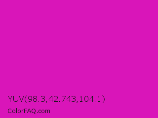 YUV 98.3,42.743,104.1 Color is a normal magenta color and the nearest color is Deep Magenta #cc00cc. Hex code #d915b9 and RGB value is rgb(217,21,185). In RGB color space, this color is composed of 85% red, 8% green, 73% blue, In CMYK color space, this color is composed of 0% cyan, 90% magenta, 15% yellow , 15% black , In HSL color space, this color has a hue angle of 310° , 82% saturation and 47% lightness.
