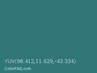 YUV 98.412,11.629,-43.334 Color is a normal cyan color and the nearest color is Ming #36747d. Hex code #31777a and RGB value is rgb(49,119,122). In RGB color space, this color is composed of 19% red, 47% green, 48% blue, In CMYK color space, this color is composed of 60% cyan, 2% magenta, 0% yellow , 52% black , In HSL color space, this color has a hue angle of 182° , 43% saturation and 34% lightness.