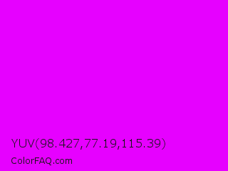 YUV 98.427,77.19,115.39 Color is a normal magenta color and the nearest color is Phlox #df00ff. Hex code #e601ff and RGB value is rgb(230,1,255). In RGB color space, this color is composed of 90% red, 0% green, 100% blue, In CMYK color space, this color is composed of 10% cyan, 100% magenta, 0% yellow , 0% black , In HSL color space, this color has a hue angle of 294° , 100% saturation and 50% lightness.