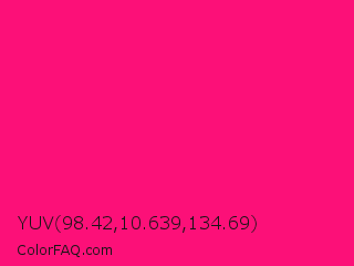YUV 98.42,10.639,134.69 Color is a normal rose color and the nearest color is Winter Sky #ff007c. Hex code #fc1078 and RGB value is rgb(252,16,120). In RGB color space, this color is composed of 99% red, 6% green, 47% blue, In CMYK color space, this color is composed of 0% cyan, 94% magenta, 52% yellow , 1% black , In HSL color space, this color has a hue angle of 334° , 98% saturation and 53% lightness.
