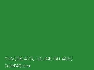 YUV 98.475,-20.94,-50.406 Color is a normal green color and the nearest color is Forest Green #228b22. Hex code #298838 and RGB value is rgb(41,136,56). In RGB color space, this color is composed of 16% red, 53% green, 22% blue, In CMYK color space, this color is composed of 70% cyan, 0% magenta, 59% yellow , 47% black , In HSL color space, this color has a hue angle of 129° , 54% saturation and 35% lightness.