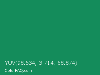 YUV 98.534,-3.714,-68.874 Color is a normal green color and the nearest color is Deep Green Cyan Turquoise #0e7c61. Hex code #148c5b and RGB value is rgb(20,140,91). In RGB color space, this color is composed of 8% red, 55% green, 36% blue, In CMYK color space, this color is composed of 86% cyan, 0% magenta, 35% yellow , 45% black , In HSL color space, this color has a hue angle of 156° , 75% saturation and 31% lightness.