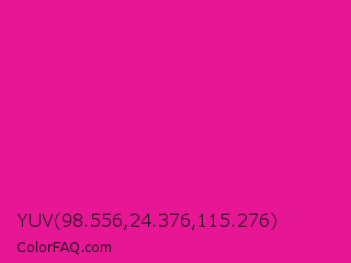 YUV 98.556,24.376,115.276 Color is a normal magenta color and the nearest color is Barbie Pink #e0218a. Hex code #e61694 and RGB value is rgb(230,22,148). In RGB color space, this color is composed of 90% red, 9% green, 58% blue, In CMYK color space, this color is composed of 0% cyan, 90% magenta, 36% yellow , 10% black , In HSL color space, this color has a hue angle of 324° , 83% saturation and 49% lightness.