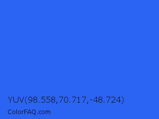 YUV 98.558,70.717,-48.724 Color is a normal blue color and the nearest color is Ultramarine Blue #4166f5. Hex code #2b63f2 and RGB value is rgb(43,99,242). In RGB color space, this color is composed of 17% red, 39% green, 95% blue, In CMYK color space, this color is composed of 82% cyan, 59% magenta, 0% yellow , 5% black , In HSL color space, this color has a hue angle of 223° , 88% saturation and 56% lightness.