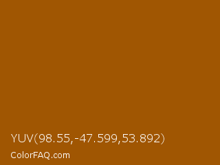 YUV 98.55,-47.599,53.892 Color is a normal orange color and the nearest color is Chelsea Gem #9e5302. Hex code #a05602 and RGB value is rgb(160,86,2). In RGB color space, this color is composed of 63% red, 34% green, 1% blue, In CMYK color space, this color is composed of 0% cyan, 46% magenta, 99% yellow , 37% black , In HSL color space, this color has a hue angle of 32° , 98% saturation and 32% lightness.