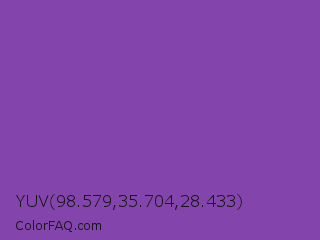 YUV 98.579,35.704,28.433 Color is a normal purple color and the nearest color is Royal Purple #7851a9. Hex code #8344ab and RGB value is rgb(131,68,171). In RGB color space, this color is composed of 51% red, 27% green, 67% blue, In CMYK color space, this color is composed of 23% cyan, 60% magenta, 0% yellow , 33% black , In HSL color space, this color has a hue angle of 277° , 43% saturation and 47% lightness.