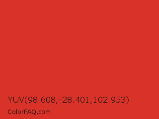 YUV 98.608,-28.401,102.953 Color is a normal red color and the nearest color is Permanent Geranium Lake #e12c2c. Hex code #d83229 and RGB value is rgb(216,50,41). In RGB color space, this color is composed of 85% red, 20% green, 16% blue, In CMYK color space, this color is composed of 0% cyan, 77% magenta, 81% yellow , 15% black , In HSL color space, this color has a hue angle of 3° , 69% saturation and 50% lightness.