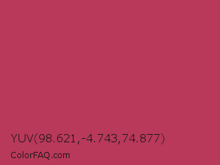 YUV 98.621,-4.743,74.877 Color is a normal red color and the nearest color is Rich Maroon #b03060. Hex code #b83959 and RGB value is rgb(184,57,89). In RGB color space, this color is composed of 72% red, 22% green, 35% blue, In CMYK color space, this color is composed of 0% cyan, 69% magenta, 52% yellow , 28% black , In HSL color space, this color has a hue angle of 345° , 53% saturation and 47% lightness.