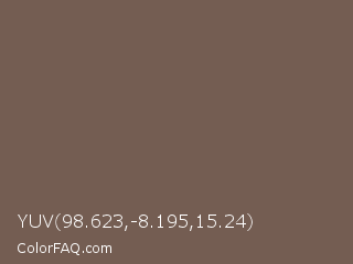YUV 98.623,-8.195,15.24 Color is a normal orange color and the nearest color is Russett #755a57. Hex code #745d52 and RGB value is rgb(116,93,82). In RGB color space, this color is composed of 45% red, 36% green, 32% blue, In CMYK color space, this color is composed of 0% cyan, 20% magenta, 29% yellow , 55% black , In HSL color space, this color has a hue angle of 19° , 17% saturation and 39% lightness.