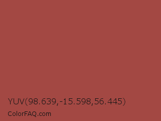 YUV 98.639,-15.598,56.445 Color is a normal red color and the nearest color is Apple Blossom #af4d43. Hex code #a34843 and RGB value is rgb(163,72,67). In RGB color space, this color is composed of 64% red, 28% green, 26% blue, In CMYK color space, this color is composed of 0% cyan, 56% magenta, 59% yellow , 36% black , In HSL color space, this color has a hue angle of 3° , 42% saturation and 45% lightness.
