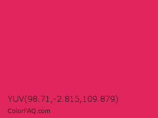 YUV 98.71,-2.815,109.879 Color is a normal rose color and the nearest color is Razzmatazz #e3256b. Hex code #e0245d and RGB value is rgb(224,36,93). In RGB color space, this color is composed of 88% red, 14% green, 36% blue, In CMYK color space, this color is composed of 0% cyan, 84% magenta, 58% yellow , 12% black , In HSL color space, this color has a hue angle of 342° , 75% saturation and 51% lightness.