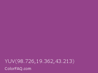 YUV 98.726,19.362,43.213 Color is a normal magenta color and the nearest color is Plum #8e4585. Hex code #94428a and RGB value is rgb(148,66,138). In RGB color space, this color is composed of 58% red, 26% green, 54% blue, In CMYK color space, this color is composed of 0% cyan, 55% magenta, 7% yellow , 42% black , In HSL color space, this color has a hue angle of 307° , 38% saturation and 42% lightness.