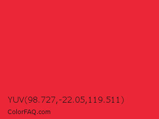 YUV 98.727,-22.05,119.511 Color is a normal red color and the nearest color is Imperial Red #ed2939. Hex code #eb2636 and RGB value is rgb(235,38,54). In RGB color space, this color is composed of 92% red, 15% green, 21% blue, In CMYK color space, this color is composed of 0% cyan, 84% magenta, 77% yellow , 8% black , In HSL color space, this color has a hue angle of 355° , 83% saturation and 54% lightness.
