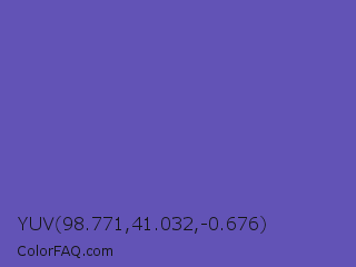 YUV 98.771,41.032,-0.676 Color is a normal indigo color and the nearest color is Blue Violet #6456b7. Hex code #6253b6 and RGB value is rgb(98,83,182). In RGB color space, this color is composed of 38% red, 33% green, 71% blue, In CMYK color space, this color is composed of 46% cyan, 54% magenta, 0% yellow , 29% black , In HSL color space, this color has a hue angle of 249° , 40% saturation and 52% lightness.