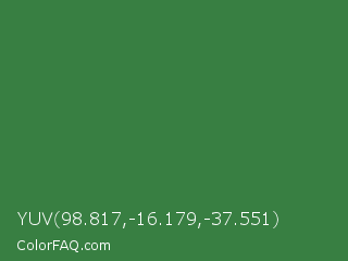 YUV 98.817,-16.179,-37.551 Color is a normal green color and the nearest color is Goblin #3d7d52. Hex code #387f42 and RGB value is rgb(56,127,66). In RGB color space, this color is composed of 22% red, 50% green, 26% blue, In CMYK color space, this color is composed of 56% cyan, 0% magenta, 48% yellow , 50% black , In HSL color space, this color has a hue angle of 128° , 39% saturation and 36% lightness.