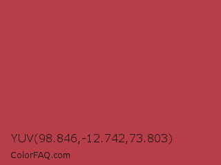 YUV 98.846,-12.742,73.803 Color is a normal red color and the nearest color is Deep Chestnut #b94e48. Hex code #b73d49 and RGB value is rgb(183,61,73). In RGB color space, this color is composed of 72% red, 24% green, 29% blue, In CMYK color space, this color is composed of 0% cyan, 67% magenta, 60% yellow , 28% black , In HSL color space, this color has a hue angle of 354° , 50% saturation and 48% lightness.