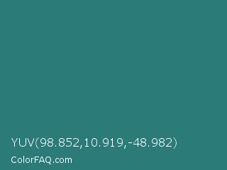 YUV 98.852,10.919,-48.982 Color is a normal cyan color and the nearest color is Myrtle Green #317873. Hex code #2b7b79 and RGB value is rgb(43,123,121). In RGB color space, this color is composed of 17% red, 48% green, 47% blue, In CMYK color space, this color is composed of 65% cyan, 0% magenta, 2% yellow , 52% black , In HSL color space, this color has a hue angle of 179° , 48% saturation and 33% lightness.