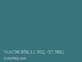 YUV 98.858,11.902,-37.586 Color is a normal cyan color and the nearest color is Ming #36747d. Hex code #38747b and RGB value is rgb(56,116,123). In RGB color space, this color is composed of 22% red, 45% green, 48% blue, In CMYK color space, this color is composed of 54% cyan, 6% magenta, 0% yellow , 52% black , In HSL color space, this color has a hue angle of 186° , 37% saturation and 35% lightness.