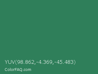 YUV 98.862,-4.369,-45.483 Color is a normal green color and the nearest color is Sea Green #2e8b57. Hex code #2f7f5a and RGB value is rgb(47,127,90). In RGB color space, this color is composed of 18% red, 50% green, 35% blue, In CMYK color space, this color is composed of 63% cyan, 0% magenta, 29% yellow , 50% black , In HSL color space, this color has a hue angle of 152° , 46% saturation and 34% lightness.