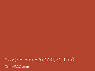 YUV 98.866,-26.556,71.155 Color is a normal red color and the nearest color is Medium Carmine #af4035. Hex code #b4442d and RGB value is rgb(180,68,45). In RGB color space, this color is composed of 71% red, 27% green, 18% blue, In CMYK color space, this color is composed of 0% cyan, 62% magenta, 75% yellow , 29% black , In HSL color space, this color has a hue angle of 10° , 60% saturation and 44% lightness.