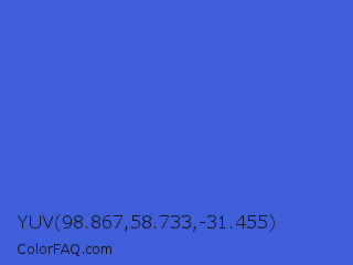 YUV 98.867,58.733,-31.455 Color is a normal blue color and the nearest color is Royal Blue #4169e1. Hex code #3f5eda and RGB value is rgb(63,94,218). In RGB color space, this color is composed of 25% red, 37% green, 85% blue, In CMYK color space, this color is composed of 71% cyan, 57% magenta, 0% yellow , 15% black , In HSL color space, this color has a hue angle of 228° , 68% saturation and 55% lightness.