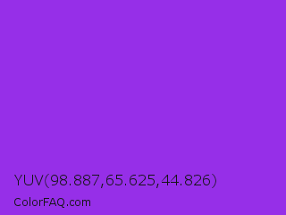 YUV 98.887,65.625,44.826 Color is a normal purple color and the nearest color is Blue Violet #8a2be2. Hex code #962fe8 and RGB value is rgb(150,47,232). In RGB color space, this color is composed of 59% red, 18% green, 91% blue, In CMYK color space, this color is composed of 35% cyan, 80% magenta, 0% yellow , 9% black , In HSL color space, this color has a hue angle of 273° , 80% saturation and 55% lightness.