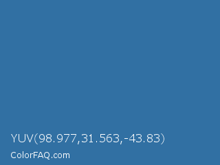 YUV 98.977,31.563,-43.83 Color is a normal blue color and the nearest color is Astral #327da0. Hex code #3170a3 and RGB value is rgb(49,112,163). In RGB color space, this color is composed of 19% red, 44% green, 64% blue, In CMYK color space, this color is composed of 70% cyan, 31% magenta, 0% yellow , 36% black , In HSL color space, this color has a hue angle of 207° , 54% saturation and 42% lightness.