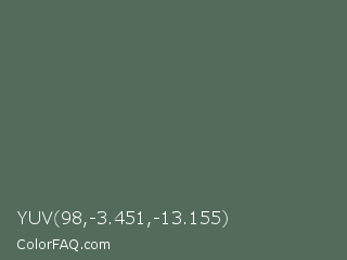 YUV 98,-3.451,-13.155 Color is a normal green color and the nearest color is Finlandia #556d56. Hex code #536b5b and RGB value is rgb(83,107,91). In RGB color space, this color is composed of 33% red, 42% green, 36% blue, In CMYK color space, this color is composed of 22% cyan, 0% magenta, 15% yellow , 58% black , In HSL color space, this color has a hue angle of 140° , 13% saturation and 37% lightness.