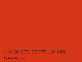 YUV 99.007,-36.978,100.849 Color is a normal red color and the nearest color is Vermilion #d9381e. Hex code #d63718 and RGB value is rgb(214,55,24). In RGB color space, this color is composed of 84% red, 22% green, 9% blue, In CMYK color space, this color is composed of 0% cyan, 74% magenta, 89% yellow , 16% black , In HSL color space, this color has a hue angle of 10° , 80% saturation and 47% lightness.