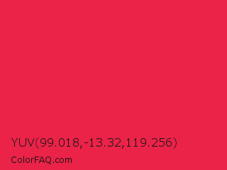YUV 99.018,-13.32,119.256 Color is a normal red color and the nearest color is Red Crayola #ee204d. Hex code #eb2348 and RGB value is rgb(235,35,72). In RGB color space, this color is composed of 92% red, 14% green, 28% blue, In CMYK color space, this color is composed of 0% cyan, 85% magenta, 69% yellow , 8% black , In HSL color space, this color has a hue angle of 349° , 83% saturation and 53% lightness.